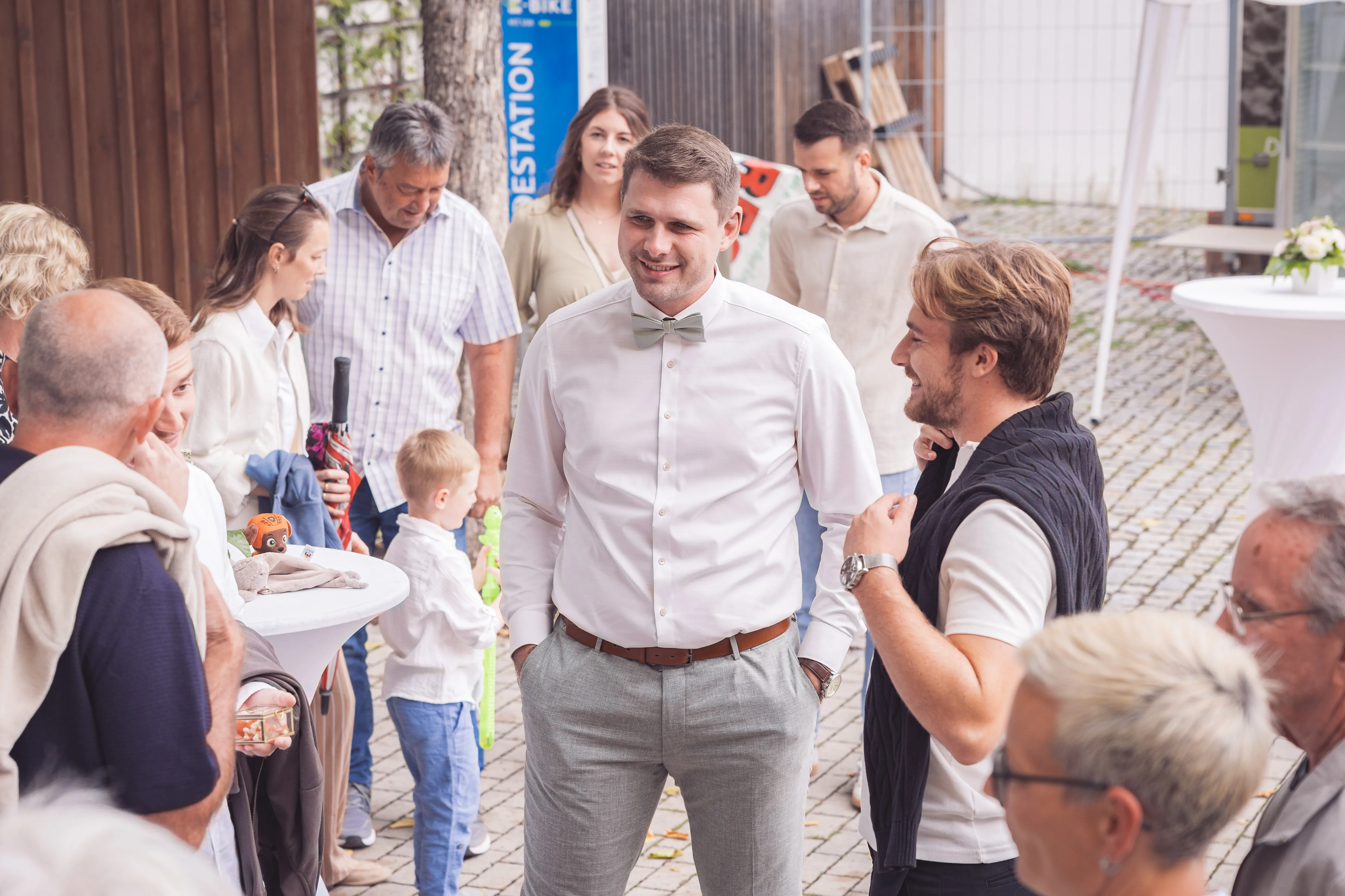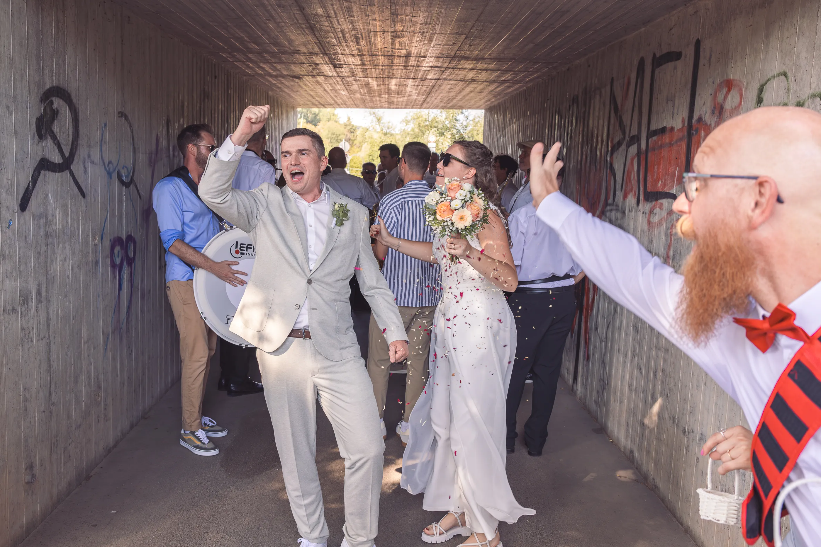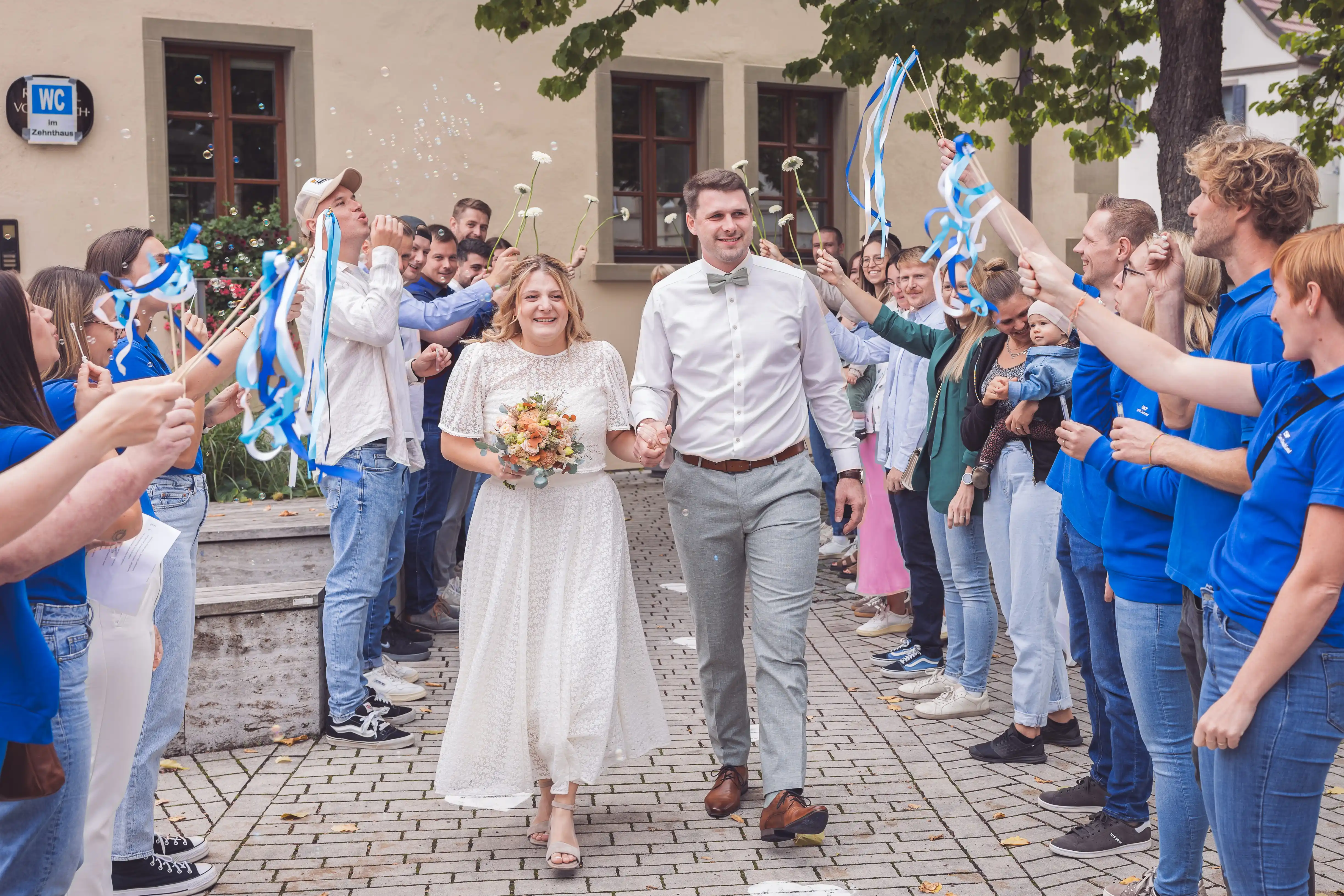 Beim Auszug wartete eine große Überraschung. Weitere Freunde, Arbeitskollegen und die Vereine empfingen das Brautpaar mit liebevollen Einlagen, Applaus und strahlenden Gesichtern. Ein Moment, der zeigte, wie sehr die beiden in ihrem Umfeld geschätzt und getragen werden.