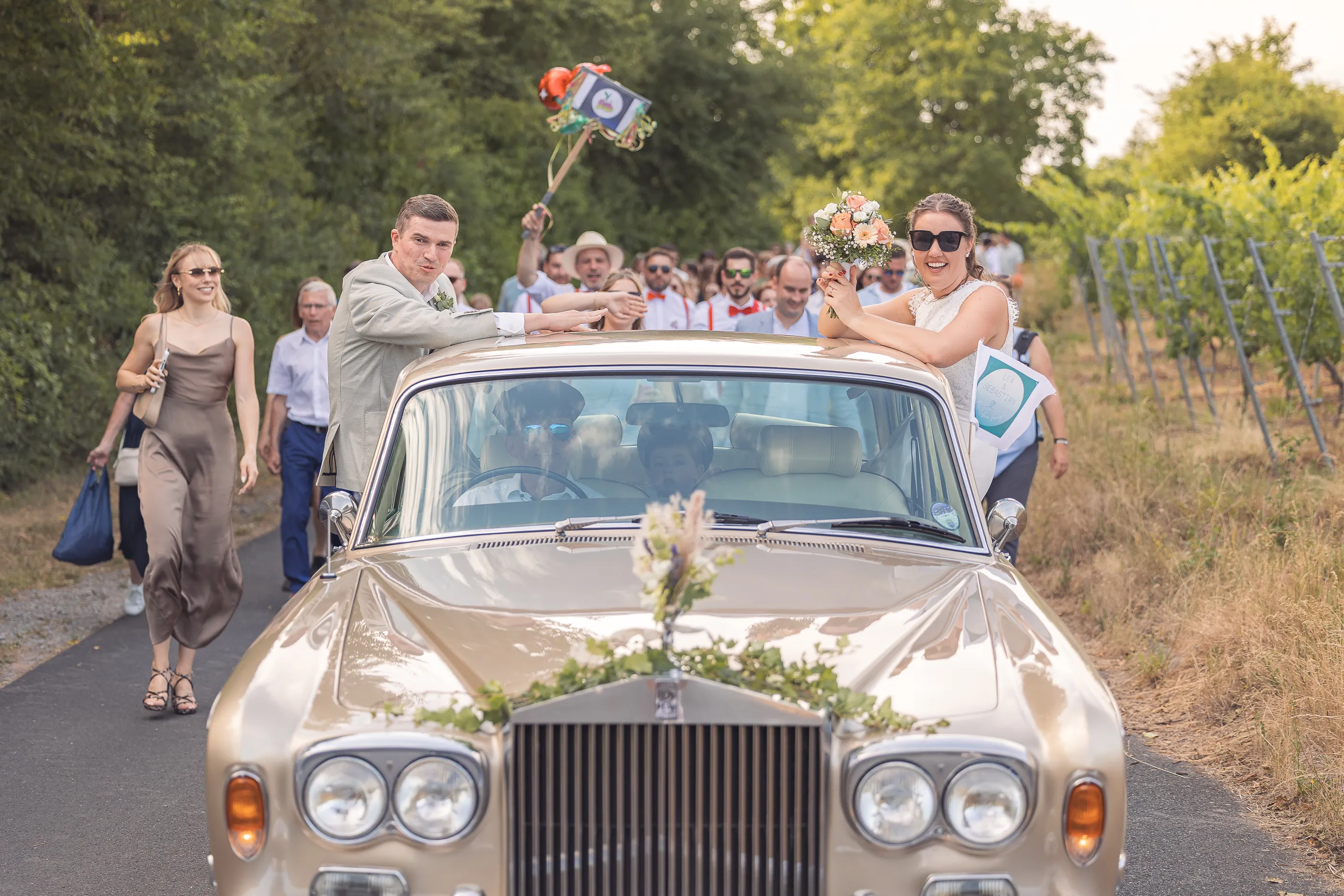 Auf dem letzten Stück wartete eine besondere Überraschung. Ein historischer Oldtimer nahm das Brautpaar auf und fuhr umringt von jubelnden Gästen bis zur Location. Dort ging es weiter mit Reden, Auftritten und ausgelassenem Tanz – ein Abend voller Liebe, Freudentränen und Erinnerungen, die für immer bleiben.