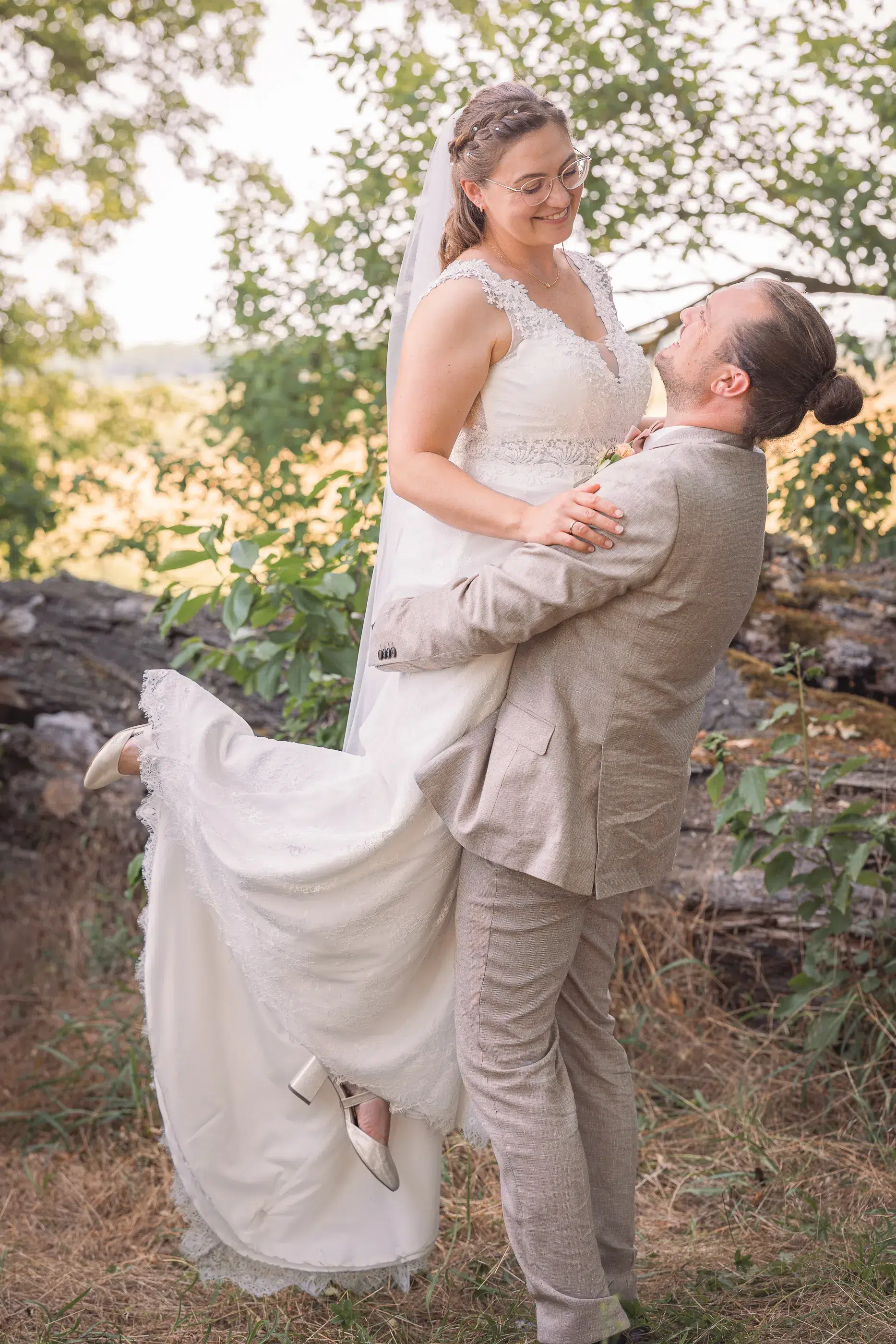 Das anschließende Brautpaarshooting im Wäldchen hoch über den Reben war entspannt und voller Nähe. Die freie Trauung war herzlich und bewegend, getragen von persönlichen Worten und glücklichen Gesichtern.